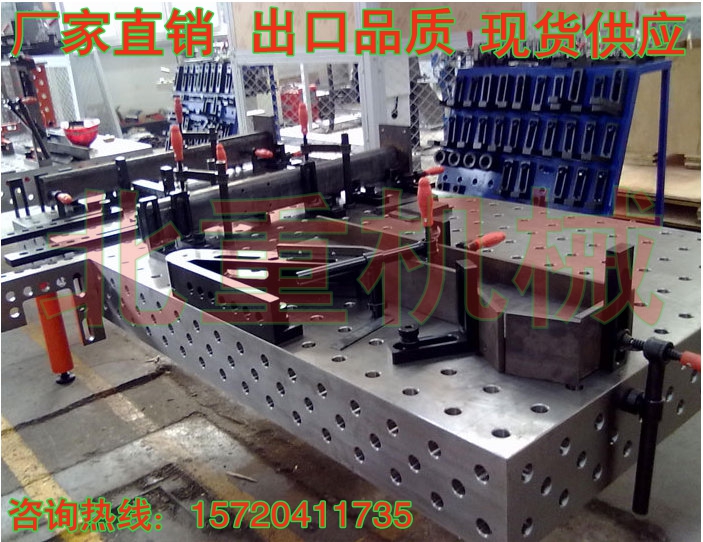 3D多功能焊接工裝臺(tái)面采用帶孔格板形式,孔徑有D28D16兩個(gè)系列。在高精度的臺(tái)面上,每隔100mm均布D28的圓孔或每隔50mm均布D16的圓孔些孔可用于拼接各種功能的定位模塊和夾具。各種功能模塊除臺(tái)面外,還有定位塊,直角塊,立柱,任意角度調(diào)整,V形塊,銷栓,各類快速夾具,間隙調(diào)整片及各種輔助模塊。模塊的設(shè)計(jì)構(gòu)思巧妙,可以進(jìn)行各種組合和反復(fù)應(yīng)用。